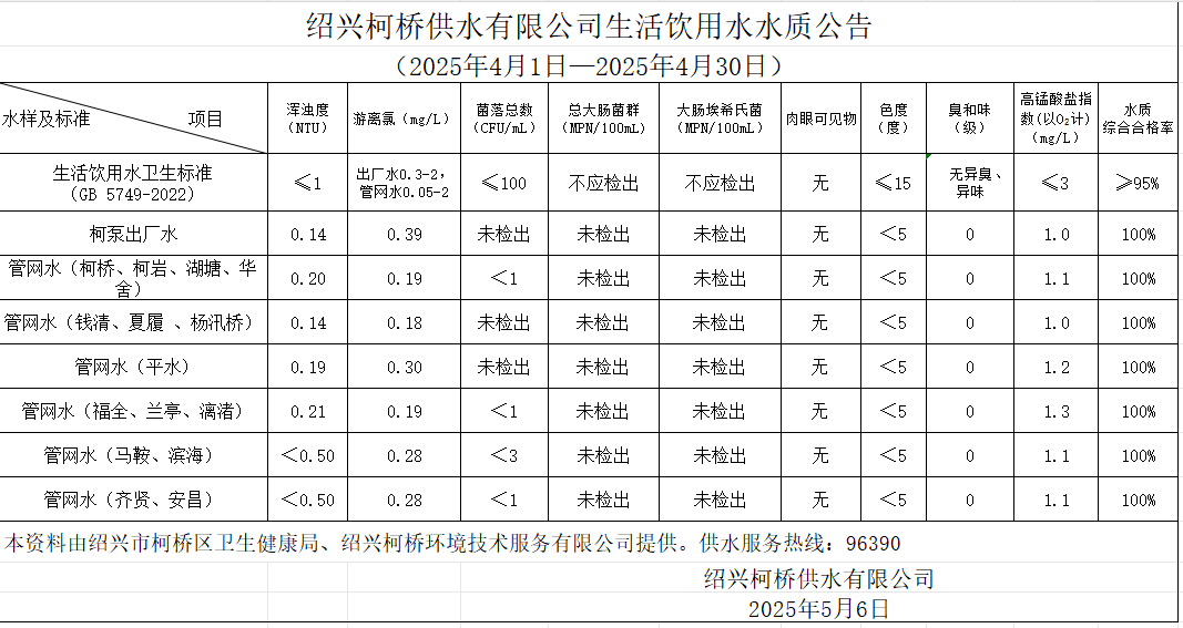 生活饮用水水质公告(2025年4月1日—2025年4月30日)