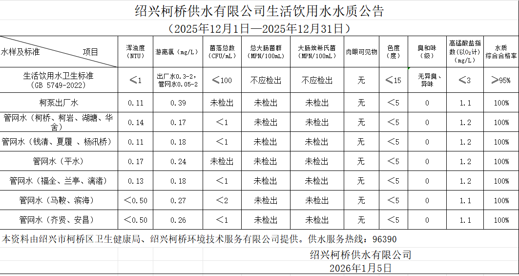 生活饮用水水质公告(2025年12月1日—2025年12月31日)