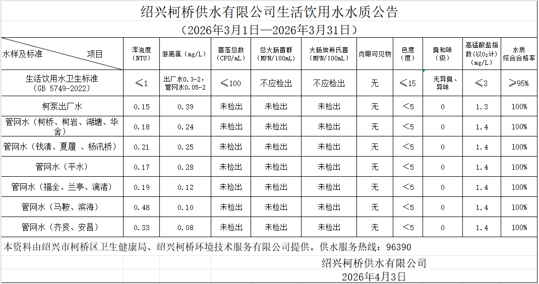 生活饮用水水质公告(2026年3月1日—2026年3月31日)