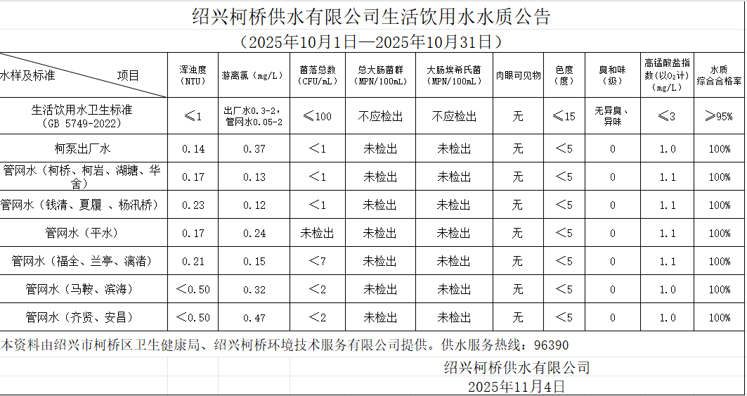 生活饮用水水质公告(2025年10月1日—2025年10月31日)