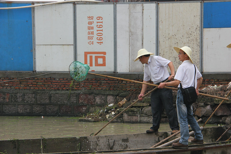 图为志愿者们船上清理打捞漂浮在河面上的垃圾